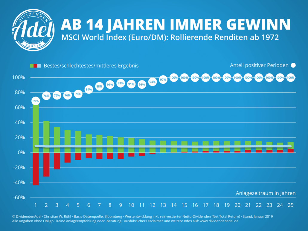 Ab 14 Jahren ist die durchschnittliche Rendite bei globalen Aktien positiv, wie Christian W. Röhl von Dividendenadel in seinem Chart zeigt. Nach 14 Jahren haben wir 100 % positive durchschnittliche Renditen um die 5 bis 6 %, trotz Kursschwankungen. Der MSCI-World bildet die Kurse von rund 1.600 börsennotierten Unternehmen aus 23 Industrieländern ab. Er ist einer der relevanten Aktien-ETF-Indizes. Dazu später mehr. Hier erst einmal als weiteren Beleg dafür, warum es wichtig ist, bei Aktieninvestments langfristig zu handeln.