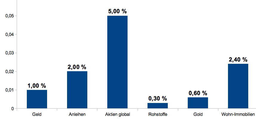 Die durchschnittlichen, realen Jahres-Renditen gibt Gerd Kommer in „Souverän investieren vor und im Ruhestand“ für die Jahre 1900 bis 2018 so an: