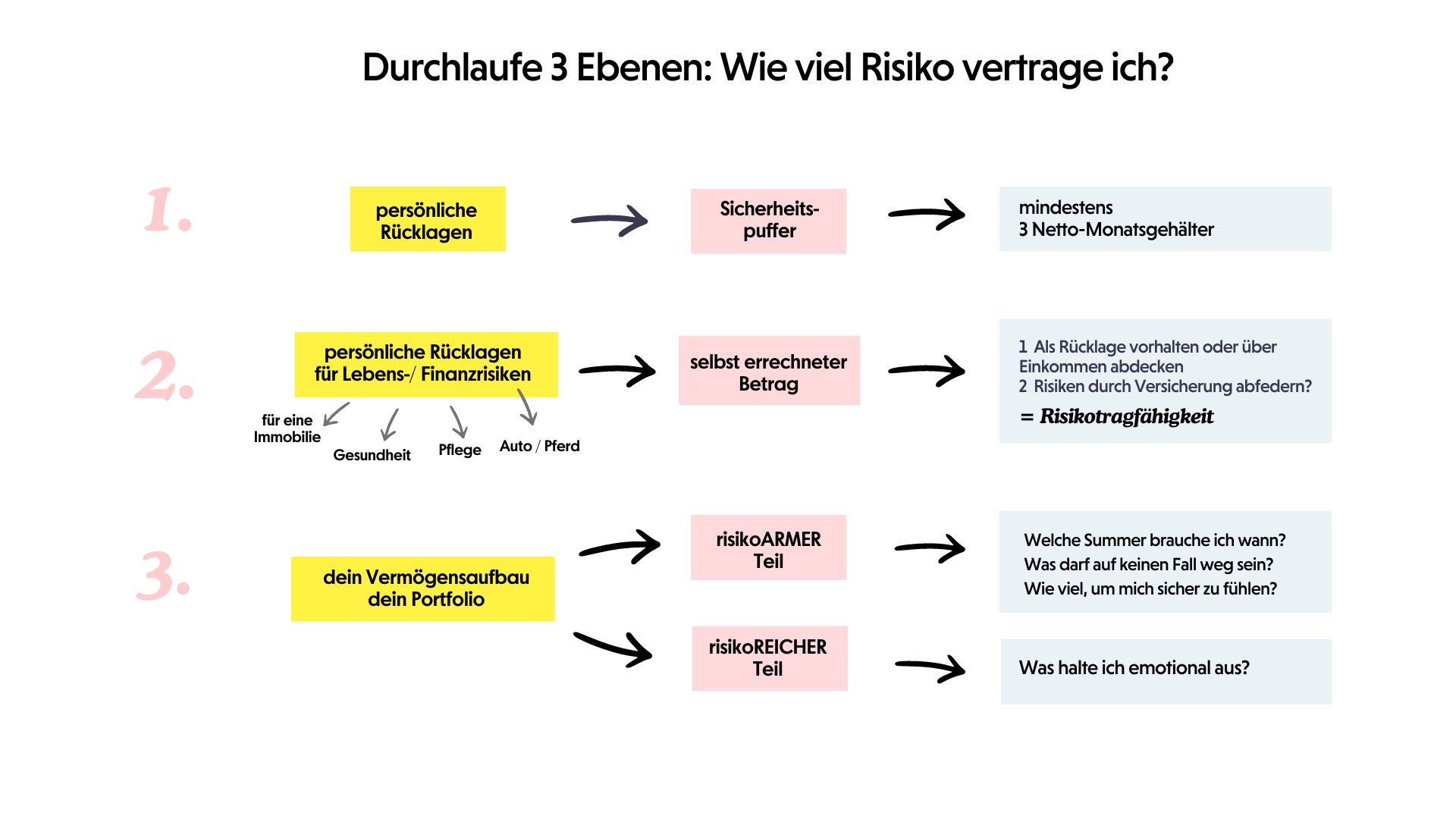 Um mit den Lebens- und Anlagerisiken gut umzugehen, strukturieren wir unsere Finanzen über drei Stufen. Die Grundlage dafür hast du im Vorkurs kennengelernt oder in meinem Kurs „Endlich die Finanzen im Griff“. Im folgenden Video zeige ich dir, wie du das praktisch umsetzen kannst.