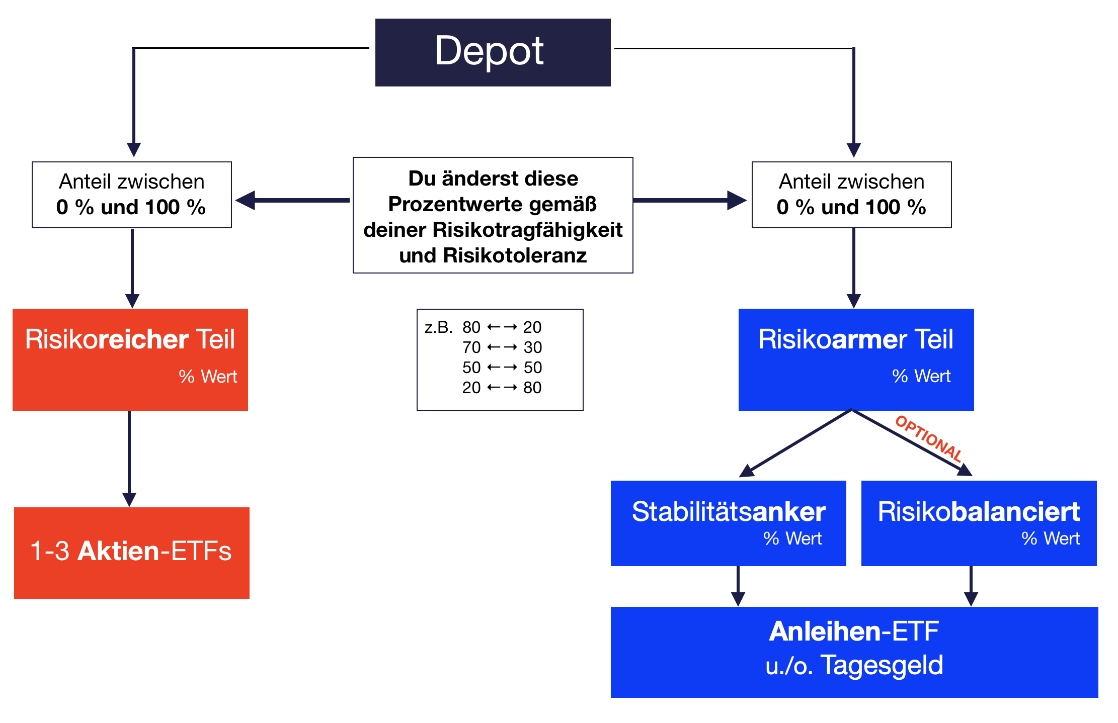 Ich nenne den risikoarmen Anteil, der auch ertragsorientiert investiert wird, risikobalanciert. Weil er Stabilität bietet und flexibel genug ist, um Chancen wahrzunehmen. Risikobalanciert ist kein definierter Begriff aus der Finanzwissenschaft. Ich nutze ihn, weil ich finde, er trifft den Charakter des Investments gut.